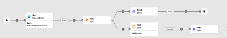 I följande exempel visas aktiviteten Wait i ett typiskt användningsfall. Ett e-postmeddelande med en kampanjkod skickas till profiler som firar sina födelsedagar. Efter två dagar skickas ett SMS till samma grupp som en påminnelse om att deras födelsedagskod snart går ut.