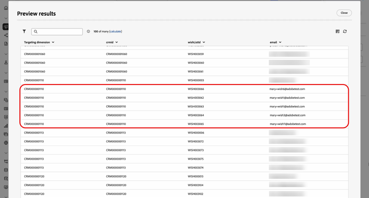I det här användningsexemplet visas flernivåutskick: skapa ett distinkt e-postmeddelande för varje önskelisteobjekt genom att använda den e-postadress som lagras med det enskilda objektet i stället för mottagarposten. Detta gör att kunderna kan få separata meddelanden för varje produkt på deras önskelista även om de använder olika e-postadresser för olika artiklar.