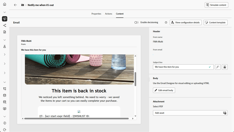 Lägg till en Email-aktivitet för att skapa ett meddelande om produkttillgänglighet. Klicka på Edit content för att börja designa ditt innehåll.