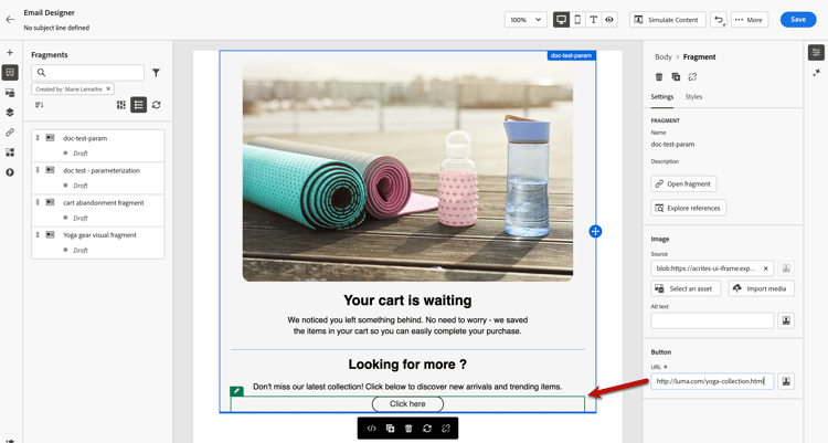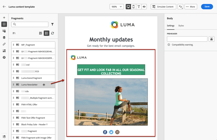Ett fragment är en återanvändbar komponent som kan refereras i ett eller flera e-postmeddelanden för Journey Optimizer-kampanjer, resor eller innehållsmall. Med den här funktionen kan man skapa flera anpassade innehållsblock som kan användas av marknadsföringsanvändare för att snabbt sammanställa e-postinnehåll i en förbättrad designprocess. Lär dig skapa och hantera fragment.