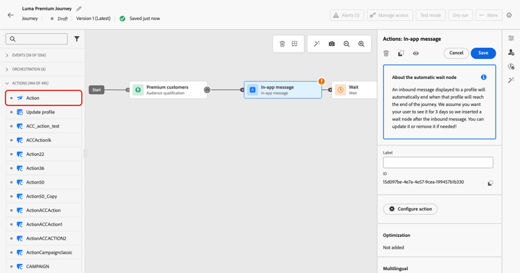 I avsnittet Actions väljer du In-app message och väljer eller skapar en ny konfiguration.