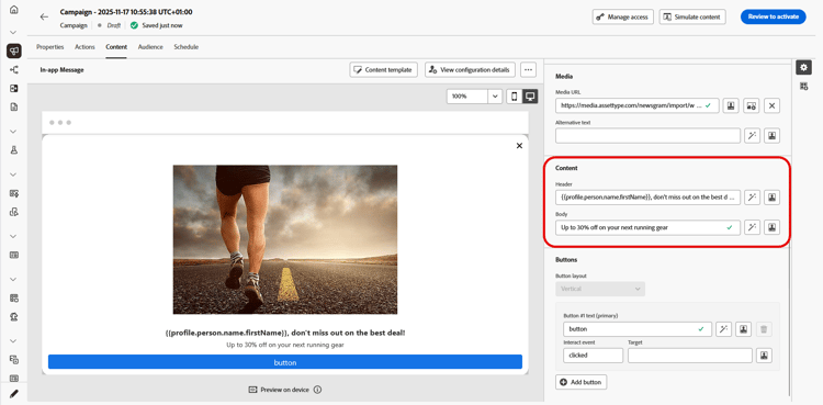 Redigera textfältet Knapp 1 (primär). Du kan också använda ikonen Personalization för att definiera innehåll och personaliseringsdata.