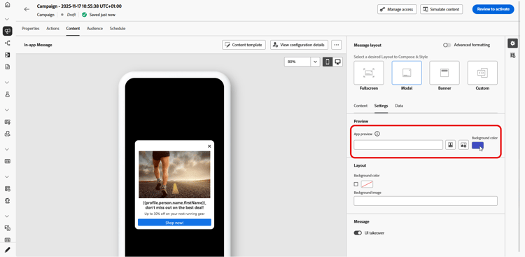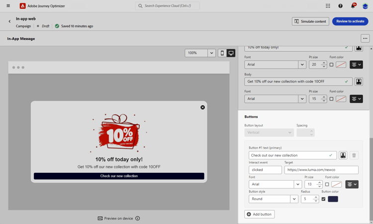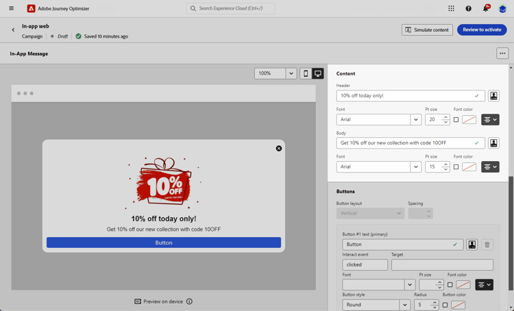 När ditt meddelande i appen har skapats och dess innehåll har definierats och anpassats kan du granska och aktivera det. Meddelanden skickas sedan enligt kampanjschemat. Läs mer på den här sidan.