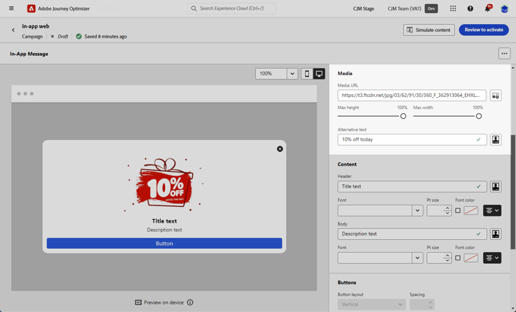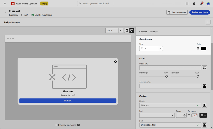 På fliken Innehåll kan du definiera och anpassa innehållet i meddelandet och formatet för knappen Stäng . Du kan också lägga till media i meddelanden i appen och lägga till åtgärdsknappar på den här fliken.