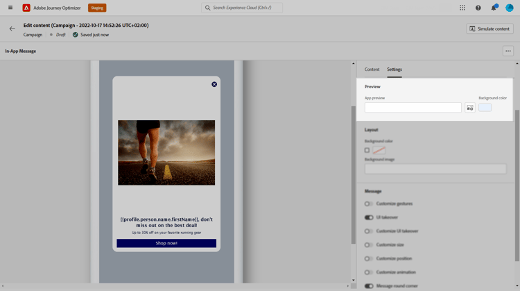 På fliken Inställningar kan du definiera meddelandelayouten och förhandsgranska meddelandet i appen. Du kan även komma åt avancerade formateringsalternativ.