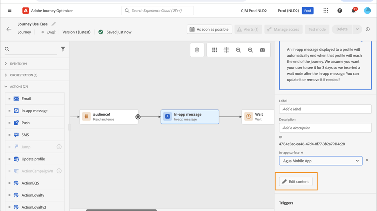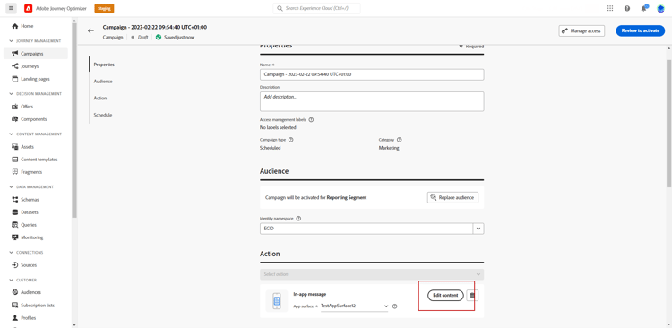 I en Campaign klickar du på knappen Action på menyn Edit content för att konfigurera meddelandeinnehållet.