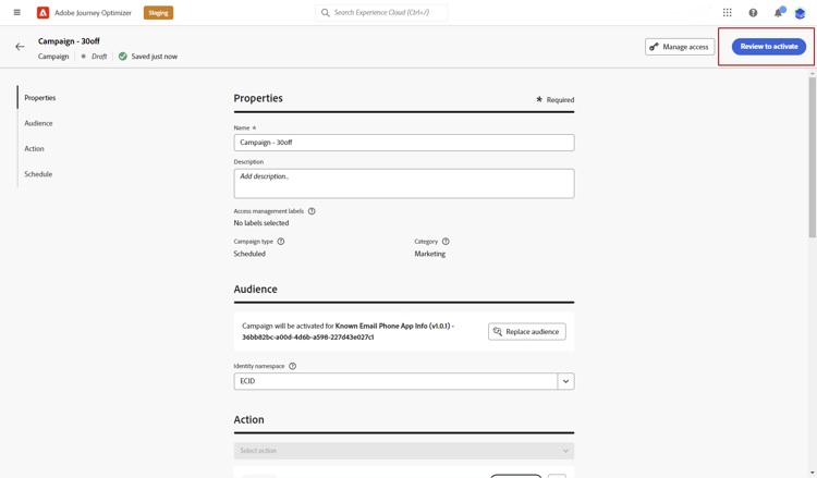 Kontrollera att kampanjen är korrekt konfigurerad och klicka sedan på Activate.