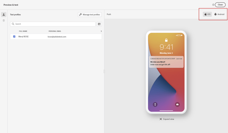När meddelandeinnehållet har definierats kan du använda testprofiler eller exempelindata som har överförts från en CSV-/JSON-fil, eller lägga till manuellt för att förhandsgranska innehållet. Om du har infogat anpassat innehåll kan du kontrollera hur det här innehållet visas i meddelandet.