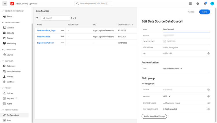 Med externa datakällor kan du definiera en anslutning till tredjepartssystem, till exempel om du använder ett bokningssystem för hotell för att kontrollera om personen har registrerat ett rum. I motsats till den inbyggda Adobe Experience Platform-datakällan kan du skapa så många externa datakällor du behöver.