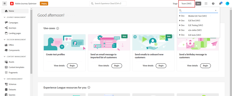 Med Journey Optimizer kan du partitionera instansen i separata virtuella miljöer som kallas sandlådor. Sandlådor tilldelas via roller i behörigheter. Lär dig tilldela sandlådor.