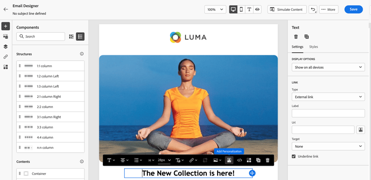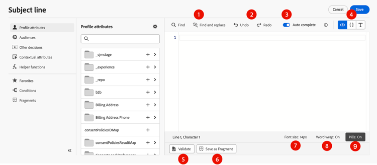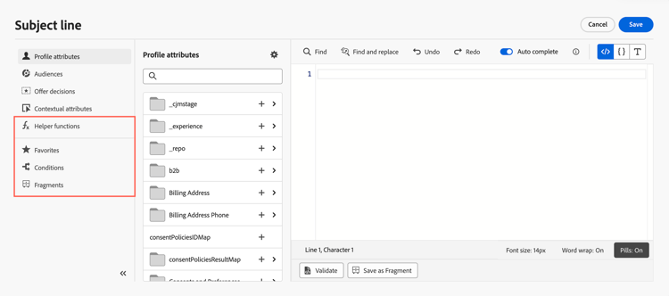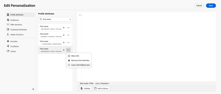 Anpassningsredigeraren är navet i personaliseringen i Journey Optimizer. Det finns i alla sammanhang där du behöver definiera personalisering som e-post, push och erbjudanden.