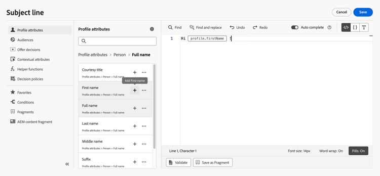 På den centrala arbetsytan skapar du din personaliseringssyntax. Om du vill anpassa meddelandet med ett attribut går du till den vänstra navigeringsrutan och klickar på knappen + för att lägga till det i uttrycket.