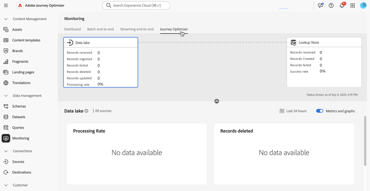 När en datauppsättning har aktiverats för sökning kan du granska statusen för inmatning i sökningstjänsten genom att gå till Monitoring-menyn och välja fliken Journey Optimizer.