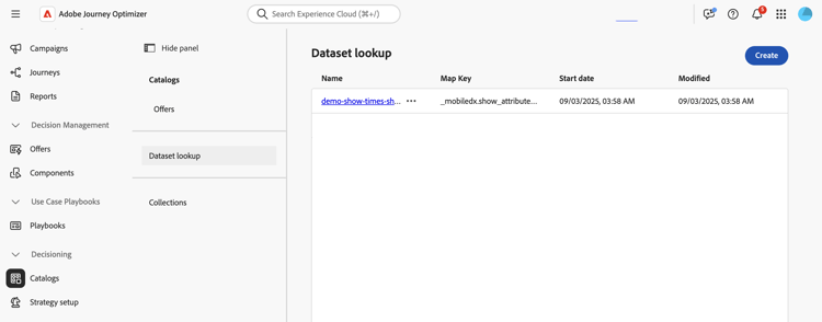 Navigera till Catalogs / Dataset lookup och klicka sedan på Create.