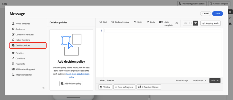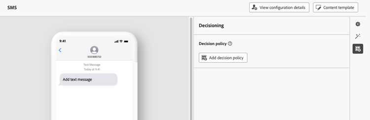 För SMS kan du lägga till en ny beslutsprincip med antingen personaliseringsredigeraren eller med menyn Beslutsfattning som finns i egenskapspanelen.
