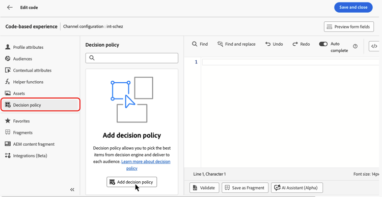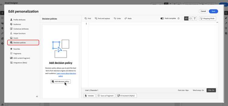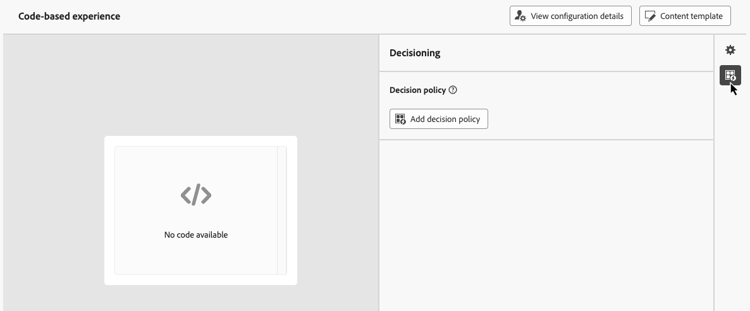 För kodbaserade upplevelser kan du lägga till en ny beslutsprincip med antingen kodredigeraren eller menyn Beslutsfattning som finns i egenskapspanelen.