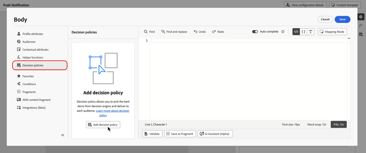 För push-meddelanden kan du lägga till en ny beslutsprincip med antingen personaliseringsredigeraren eller menyn Beslutsfattning som finns i egenskapsrutan.