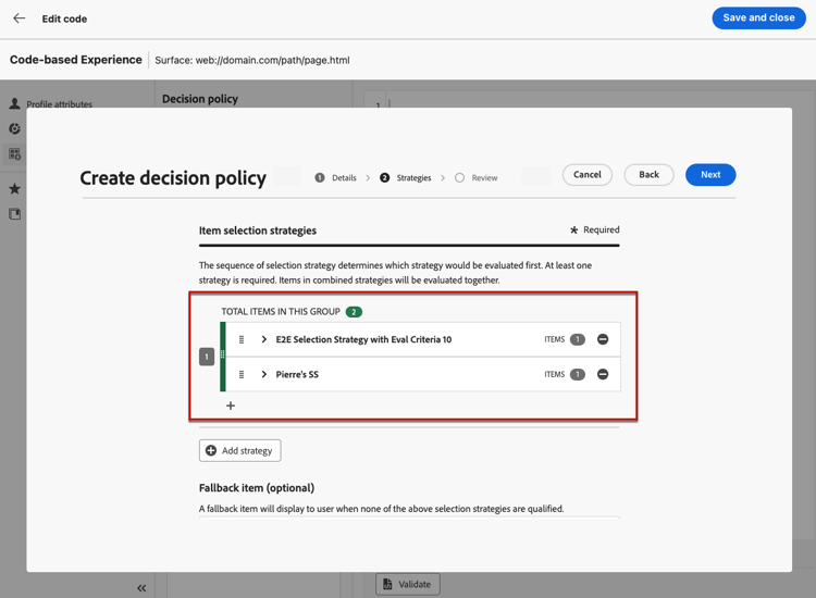 Selection strategy - Beslutsstrategier utnyttjar samlingar som är kopplade till berättigandebegränsningar och rangordningsmetoder för att avgöra vilka objekt som ska visas. Du kan välja en eller flera befintliga markeringsstrategier eller skapa en ny med knappen Create selection strategy. Lär dig hur du skapar urvalsstrategier