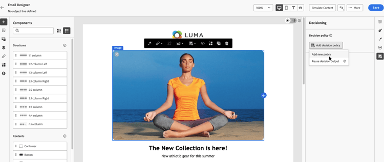 Lägg till en ny beslutsprincip med antingen anpassningsredigeraren eller menyn Beslutsfattare som finns i e-postdesignern.