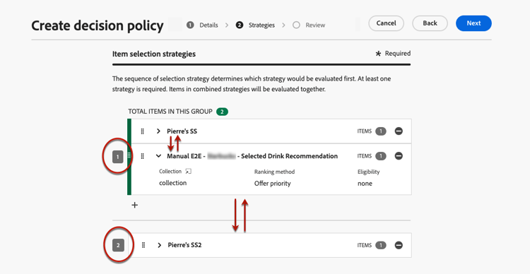 När du lägger till flera beslutsposter och/eller strategier utvärderas de i en viss ordning. Det första objektet som lades till i sekvensen utvärderas först och så vidare. Om du vill ändra standardsekvensen drar och släpper du objekten och/eller grupperna för att ordna om dem som du vill. Expandera avsnittet nedan om du vill ha mer information.