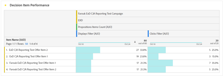 För att se hur era beslut fungerar kan ni visa färdiga beslutsvärden i kampanjen eller reserapporten, eller skapa anpassade Customer Journey Analytics-kontrollpaneler för att mäta resultat och få insikter om hur era beslutspolicyer och erbjudanden levereras och engageras med. Läs mer om beslutsrapportering.