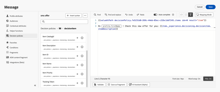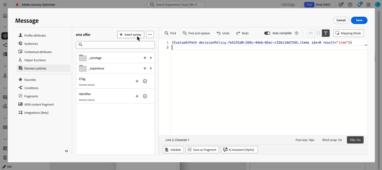 För kanalerna SMS och Push måste du infoga attribut efter syntaxkoden för beslutsprincipen. Den här syntaxen ska alltid hållas på rad 1.