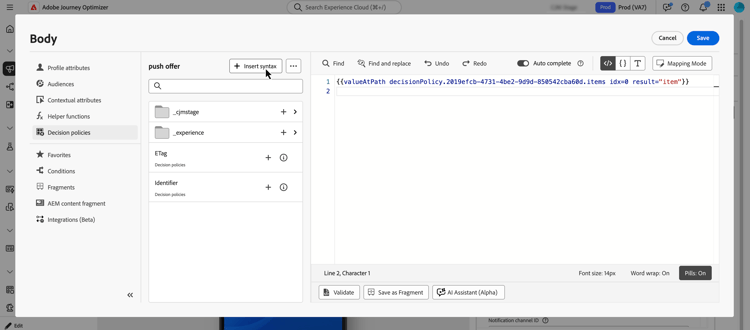 Välj Insert syntax om du vill lägga till koden för din beslutsprincip.