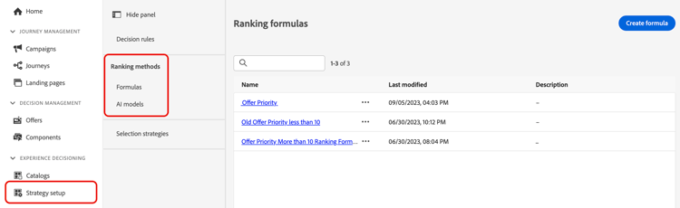 Navigera till menyn Strategy setup och välj sedan menyn Formulas eller AI models beroende på vilken typ av rankning du vill använda.