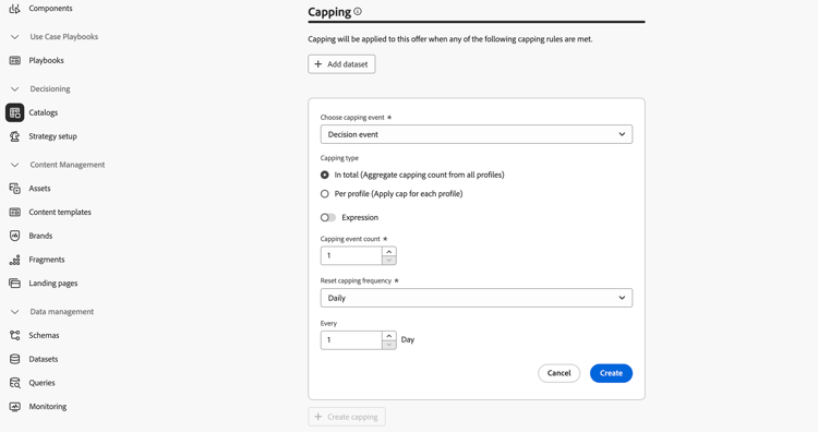 Begränsning används som en begränsning för att definiera det maximala antal gånger som ett erbjudande kan presenteras. Genom att begränsa antalet gånger användarna får specifika erbjudanden kan ni undvika att överdriva era kunder och därmed optimera varje kontaktyta med det bästa erbjudandet. Du kan skapa upp till 10 takbeläggningar för ett visst beslutsobjekt.