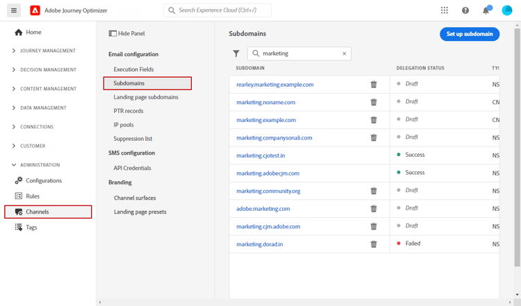 Delegera underdomäner: För alla nya underdomäner som ska användas i Journey Optimizer är det första steget att delegera den. Läs mer