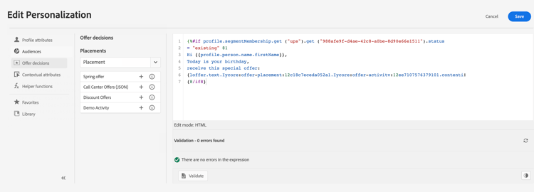 Lägg till erbjudanden och beslut. Leverera det bästa erbjudandet till varje kund vid rätt tidpunkt med hjälp av AI-styrda beslut. Lär dig mer om Beslutshantering och Experience Decision.
