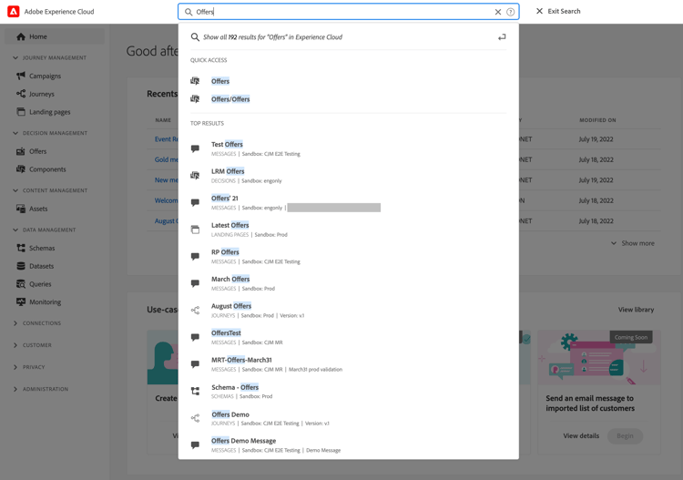 I Adobe Journey Optimizer-gränssnittet kan du använda den enhetliga sökfunktionen i Adobe Experience Cloud i mitten av det övre fältet för att hitta resurser, resor, datauppsättningar med mera i dina sandlådor.