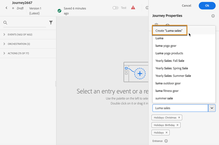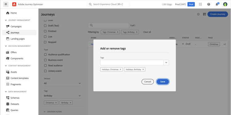 Med Adobe Experience Platform enhetliga taggar kan du enkelt klassificera dina Journey Optimizer-objekt och förbättra sökningen från listorna.