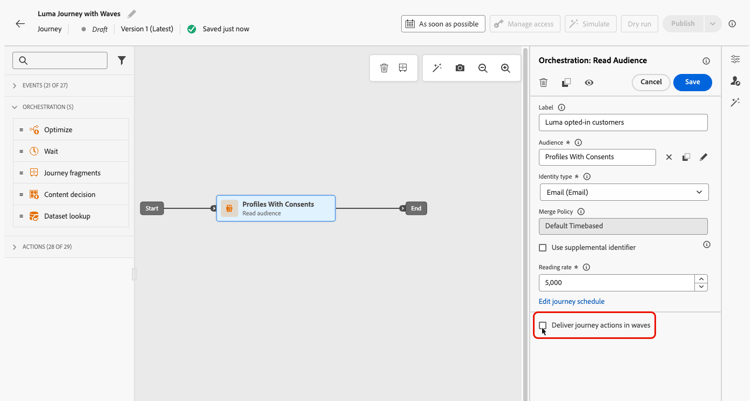 Dubbelklicka på aktiviteten Read Audience för att öppna dess egenskaper och välj alternativet Deliver journey action in waves.