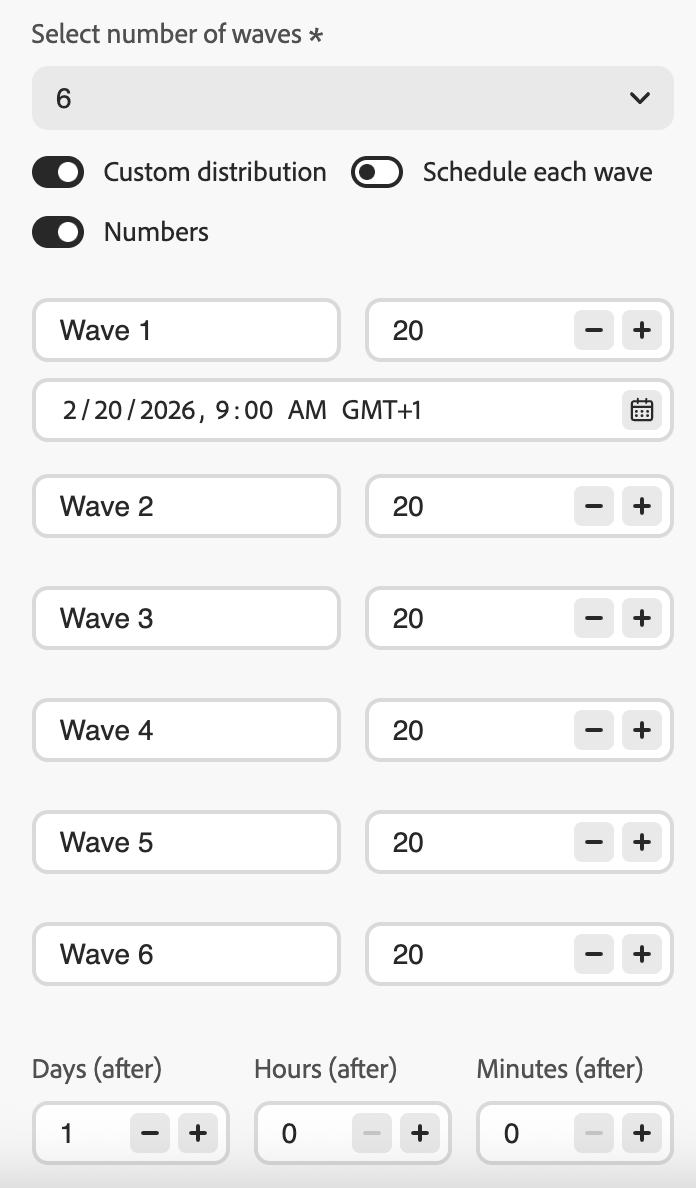 Ni konfigurerar det på kundresenivå när ni definierar hur målgruppen ska gå in och hur åtgärderna ska schemaläggas. Du definierar antalet vågor, deras storlek (som en procentandel av publiken eller som absoluta tal) och när varje våg körs.