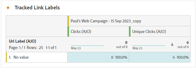Tabellen Tracked link label ger viktiga insikter i besökarnas engagemang med de URL:er som ingår i dina meddelanden, och ger värdefull information om vilka länkar som lockar mest interaktion.