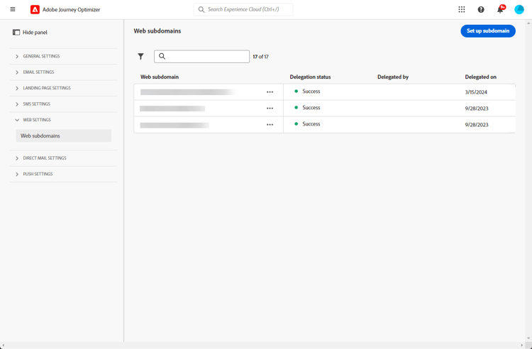 Som standard kan du i Journey Optimizer delegera upp till 10 underdomäner totalt (som omfattar både e-post- och webbkanaler). Beroende på ditt licensavtal kan du dock delegera upp till 100 underdomäner. Kontakta Adobe och läs mer om hur många underdomäner du har rätt till.