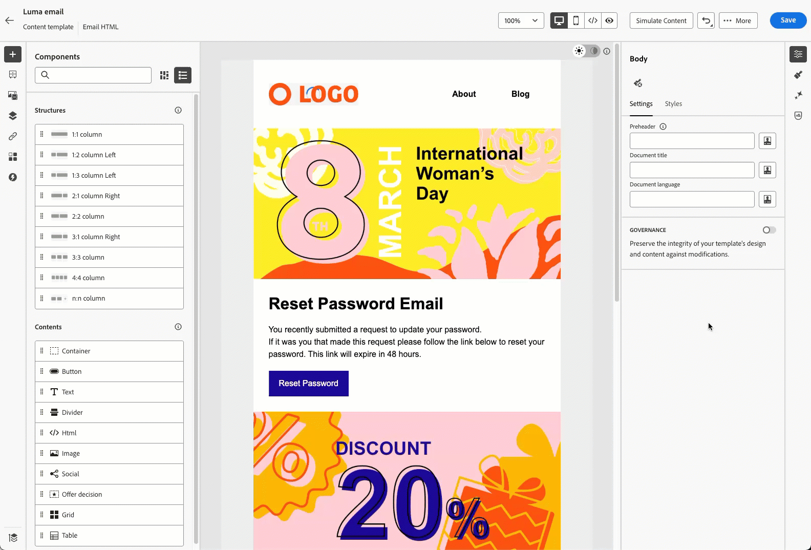 Med det avancerade HTML-läget för mallar för e-postinnehåll kan du redigera HTML-källan för ditt innehåll i e-postprogrammet Designer, lägga till avancerade uttryck (t.ex. villkor) i källan och växla mellan HTML-vyn och skrivbordsvyn utan att ändringarna går förlorade.