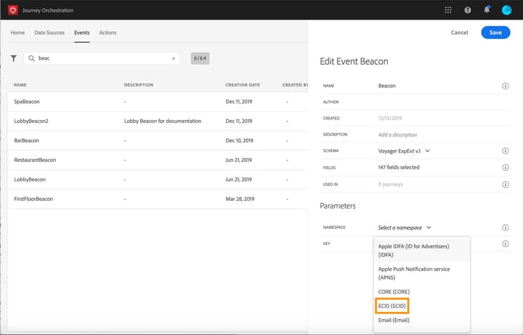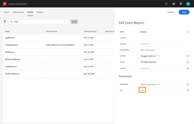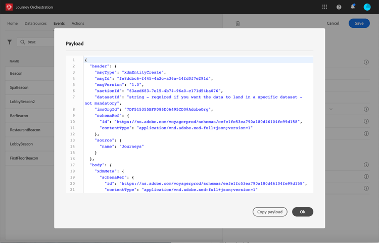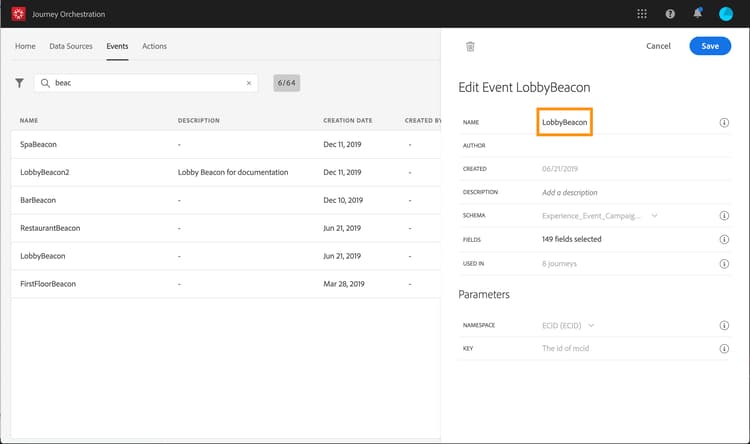 På samma sätt skapar du händelsen"RestaurantBeacon". Dina två beacon-händelser skapas och kan nu användas under vår resa. Nu måste du konfigurera mobilprogrammet så att det kan skicka den förväntade nyttolasten till API:erna för direktuppspelning. Läs den här sidan.