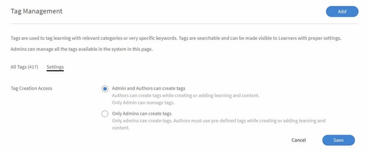 Administratörer kan nu hantera taggar i Learning Manager. Använd bättre taggning och hanterbar databas för att hjälpa elever att söka bättre och få lämpliga sökresultat snabbt. Du kan hantera överflödiga, felstavade och irrelevanta taggar med den här funktionen. Du kan också lägga till, redigera, ta bort, lägga till och ersätta märkord.