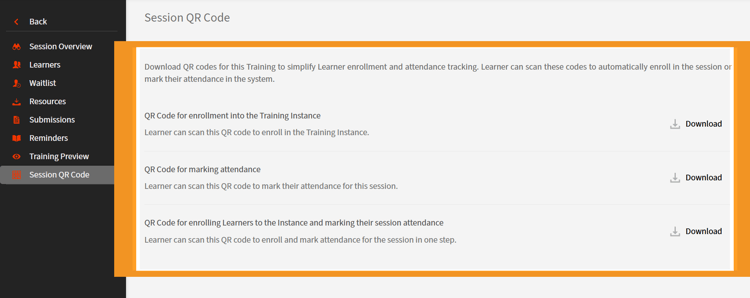 Instruktörer kan ladda ned QR-koder för sina tilldelade sessioner så att elever kan registrera sig för en kursinstans och markera närvaro eller slutförande genom att skanna QR-koden.