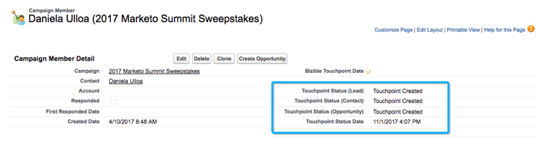 Om det här alternativet är aktiverat skickar Marketo Measure ett statusvärde till Campaign-medlemmen i fyra olika fält som ingår i det installerade paketet: Touchpoint-status (lead), Touchpoint-status (kontakt), Touchpoint-status (säljprojekt) och Touchpoint-statusdatum. Detta hjälper kunderna att granska om en kontaktyta har skapats som Buyer Touchpoint eller Buyer Attribution Touchpoint, beroende på vilket objekt den hör till. Slutpunktens statusdatum är helt enkelt det sista datumet då statusen uppdaterades för Campaign-medlemmen.