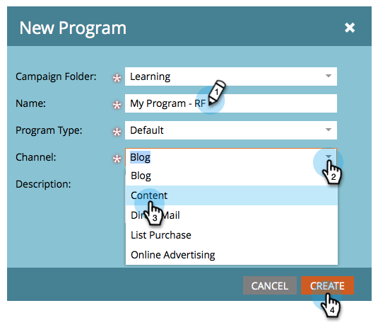 note tip TIP Inkludera dina initialer i slutet av programnamnet för att göra det unikt. note note NOTE Ett program är ett specifikt marknadsföringsinitiativ. kanalen är avsedd att vara leveransmekanism, som webbinarium, sponsring eller online-annons. Du kan se olika kanalalternativ i listrutan, beroende på vad som är tillgängligt i din egen instans. Du kan även skapa en egen kanal.