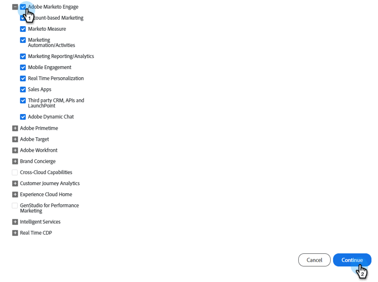 bredvid Experience Cloud för att expandera menyn. Gör samma sak för Adobe Marketo Engage.