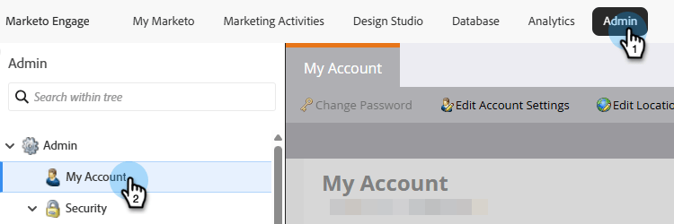 Klicka på Mitt konto i avsnittet Admin i Marketo Engage.