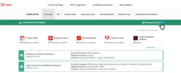På status.adobe.com klickar du på Hantera prenumerationer.