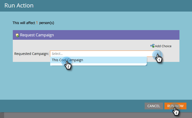 Välj kampanjen som du vill att personen ska placeras i och klicka på Run Now.