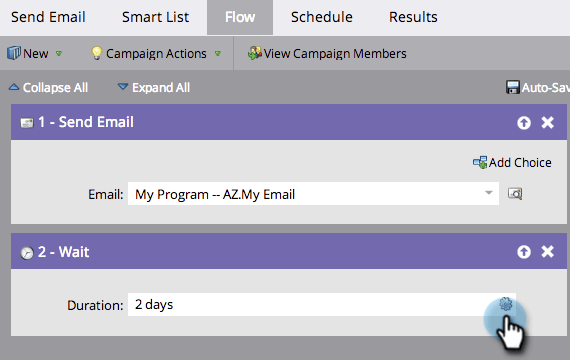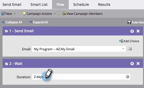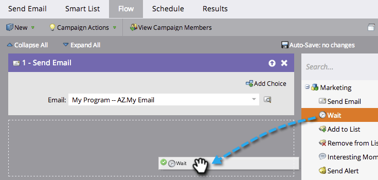Dra över flödessteget Flow på fliken Smart Campaign Wait.
