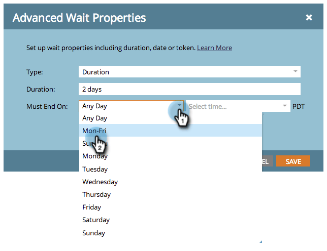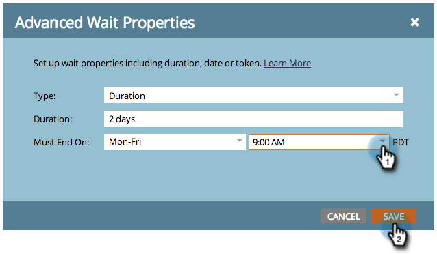 note note NOTE Exempel En person utlöser en smart kampanj på fredag kl. 17.00. Väntesteget är avancerat: 48 timmar och måste avslutas kl. 9.00 på Mon-Fri. Resultatet blir att personen fortsätter i flödet måndag 09:00. Detta är första M- F- datumet efter 48 timmar. note note NOTE Den varaktighet, datum, tid och dagar som används baseras på din prenumerations tidszon. related-articles Related Articles