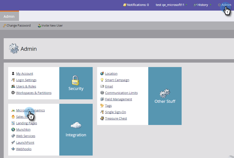 Gå till Admin och välj Microsoft Dynamics.